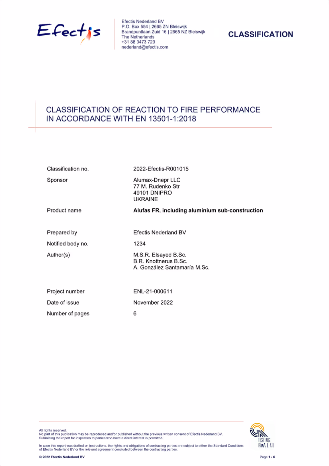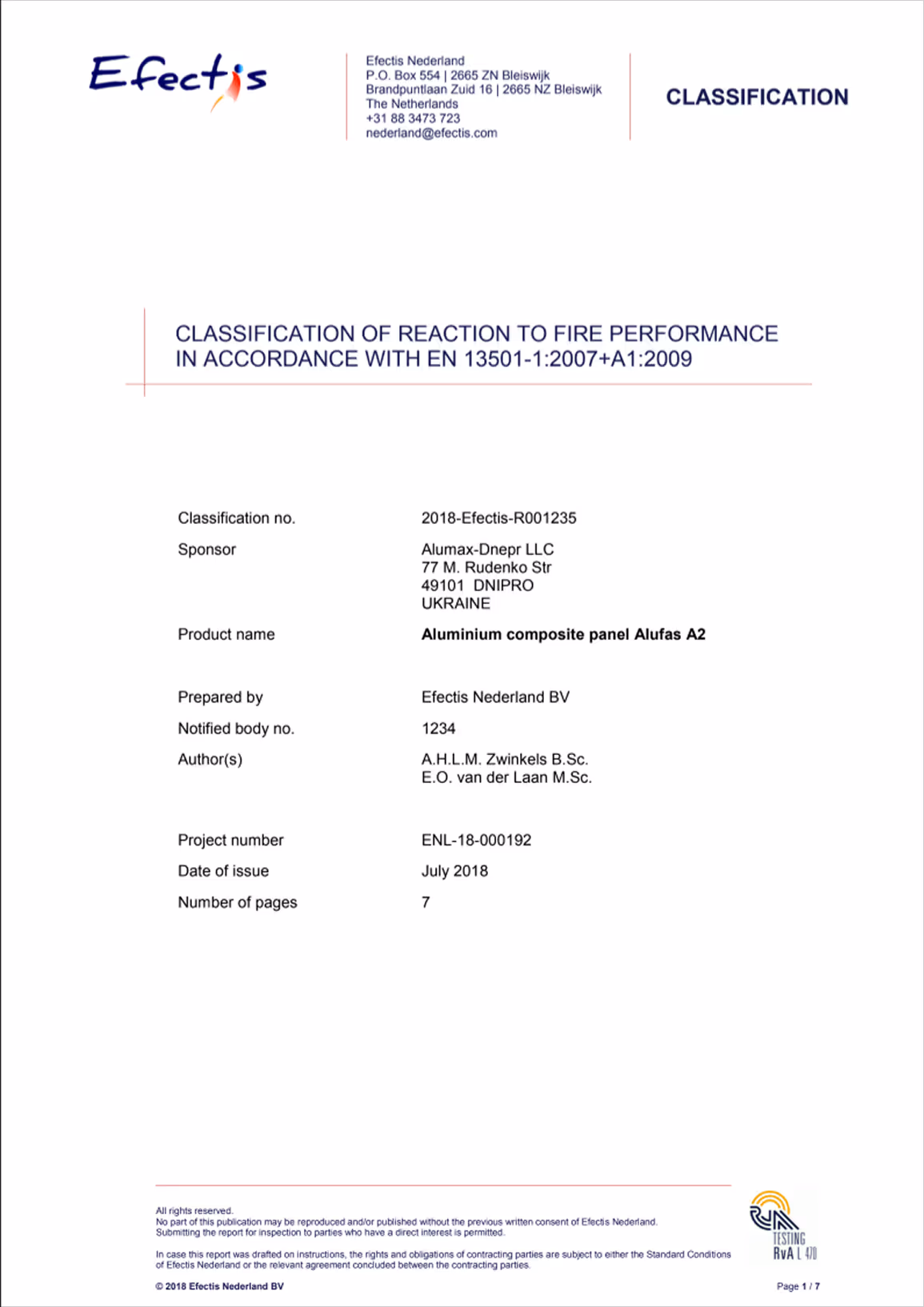 ALUFAS®A2 сертифіковані компанією Efectis Nederland B.V. та мають клас горючості A2-s1, d0.
