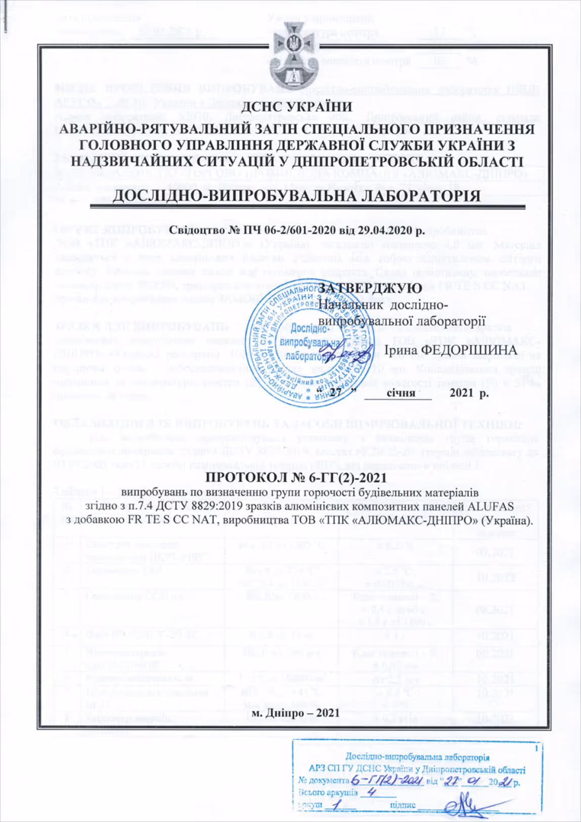ПРОТОКОЛ Nº 6-ГГ(2)-2021 випробувань по визначенню групи горючості будівельних матеріалів згідно з п.7.4 ДСТУ 8829:2019